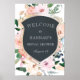Accueillez vos invités à votre fête de mariage avec ce panneau de bienvenue élégant représentant un blason en or rose aquarellisé entouré de fleurs roses, pêche et roses et de feuillage vert luxuriant. Personnalisez avec vos informations ou cliquez sur "Cliquez pour personnaliser davantage" pour modifier les styles, la taille et les couleurs de police. Ajoutez le nom de l'invité d'honneur, la date de la fête et le texte de bienvenue personnalisé à l'aide des champs fournis.