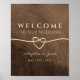 Simple, élégante, moderne, affiche de bienvenue pour un mariage en bois rustique avec un cœur de corde dorée et une écriture calligraphique tendance.