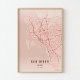 Une superbe impression artistique de la carte de San Diego rendue dans une palette de couleurs corail vibrantes. Chaque rue, autoroute et voie navigable est cartographiée avec précision sur un fond corail riche. Parfait comme pièce maîtresse pour votre maison, votre bureau, ou comme cadeau pour tout San Diegan.