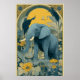 Cette affiche de cirque Art nouveau en bleu et jaune fait partie d'un ensemble de 4 (vendus séparément). Elle représente un éléphant dressé.