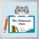 Customisez cette affiche personnalisée de classe d'un chat tenant une bannière blanche avec le nom de l'enseignant, le crayon et les livres au premier plan. Va égayer n'importe quelle classe d'école primaire. La couleur Arrière - plan peut également être changée.