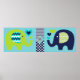 L'affiche de crèche Les amis éléphants présente un fond à rayures diagonales sarcelle et blanc avec un éléphant vert citron et un éléphant bleu marine avec des cœurs de bleu marine, sarcelle et vert citron, une affiche au design coloré et amusant pour la chambre de bébé ou la chambre d'un enfant plus âgé !