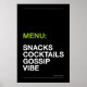 Égayez votre cuisine avec humour ! Affiche « MENU : EN-CAS, COCKTAILS, POTINS & AMBIANCE » en typographie moderne. Disponible en plusieurs couleurs de fond, parfait comme décoration intérieure, cadeaux ou art mural de cuisine.