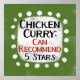 Un design typographique amusant qui dit "Poulet au curry : je recommande, 5 étoiles". C'est un texte noir et rouge sur un rectangle blanc avec des points blancs funky et ludiques qui l'entourent, le tout sur un fond vert.