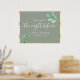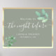 Élégante pancarte de bienvenue pour dîner de répétition en vert sauge doux avec feuilles d'eucalyptus aquarelle et bordure en faux or. Un design botanique raffiné et moderne parfait pour accueillir les invités la veille de votre mariage. Personnalisez avec vos noms et date.