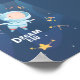 L'affiche de garçon astronaute Rêve Grand montre un bébé garçon astronaute flottant dans l'espace. Le texte blanc ci-dessous dit : Rêve Grand. Il est entouré d'étoiles et de constellations. Parfait pour le mur de la nurserie de votre petit rêveur.