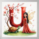 Standing serenely beside the letter is a gentle fairy with long, flowing black hair and rosy cheeks. She wears an exquisite gown that gradients from deep red at the bodied through coral to soft peachy-pink at the flowing hem, decorated with intricate golden swirl patterns and delicate embroidery throughout. Her magnificent butterfly-style wings feature warm peachy-gold tones with elegant spiral designs. The fairy's calm, peaceful expression and graceful posture embody the patience and wisdom associated with the tortoise.
