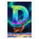 Ajoutez une touche d'émerveillement et de magie nordique à votre espace avec ce poster de la lettre D aurorale. Une lettre D radieuse s'élève au-dessus d'une forêt enneigée, illuminée par des rubans fluides de lumières boréales dans des nuances lumineuses de turquoise, d'émeraude et de violet. L'aurore danse dans le ciel nocturne, jetant une douce lueur sur la neige et illuminant doucement un renne paisible debout à la base du monogramme.