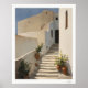 Un escalier de village méditerranéen blanchi à la chaux avec des marches en pierre, des murs incurvés et des plantes en pot, capturant le caractère de l'architecture côtière sous la lumière chaude du soleil.