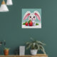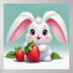 Un doux lapin blanc tenant des fraises avec un sourire heureux et de grandes oreilles roses. Cette oeuvre d'art adorable est parfaite pour les nurseries, les chambres d'enfants ou pour quiconque aime les impressions d'animaux mignons. Elle ajoute une touche joyeuse et ludique à tout décor mural.