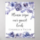Une bordure florale élégante de roses violettes aquarelles encadre cette affiche de mariage hivernal chic qui lit "Veuillez signer notre livre d'or" au sein des belles fleurs violettes et des feuilles botaniques de lavande. Parfait, panneau de signature de livre d'or personnalisé.