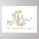 Joli poster avec monogramme et nom personnalisé parfait pour la chambre ou la salle de jeux d'une fille dans des tons de gris, blanc, jaune, rose et violet. Personnalisez avec le nom de votre enfant commençant par A, et la signification du nom pour un effet vraiment personnalisé dans la chambre ou la nurserie de votre enfant, cet exemple est pour le nom A Alice Noble, fort mais tendre et doux. Jolie affiche idéale pour un nouveau-né, un cadeau de baptême ou de baby shower. © Monogramme unique A avec cœurs et fleurs, description et conception graphique de Sarah Trett. www.sarahtrett.com pour www.mylittleeden.com