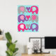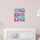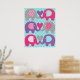 L'affiche de nurserie Amour d'Éléphant présente six éléphants en gris, rose et violet avec des oreilles à motifs sur un fond bleu sarcelle à pois !