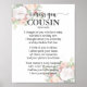 Poème « Je te manque » : « Je t'ai pensé avec amour aujourd'hui, mais cela n'est pas nouveau. Je pensais à toi hier et les jours précédents aussi. Je pense à toi en silence. Je prononce souvent ton nom. Tout ce que j'ai, ce sont des souvenirs et ta photo dans un cadre. Ton souvenir est mon trésor dont je ne me séparerai jamais. Dieu te garde dans sa protection, je t'ai dans mon cœur. » Parfait pour se souvenir d'un cousin bien-aimé.