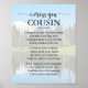 Poème « Tu me manques » : « Je pense à toi avec amour aujourd'hui, mais ce n'est pas nouveau. Je pensais à toi hier et les jours précédents aussi. Je pense à toi en silence. Je prononce souvent ton nom. Tout ce que j'ai, ce sont des souvenirs et ta photo dans un cadre. Ton souvenir est mon trésor dont je ne me séparerai jamais. Dieu te garde dans son amour, je t'ai dans mon cœur. » Parfait pour se souvenir d'un cousin bien-aimé.