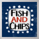 Un design de message typographique amusant et mignon qui dit "Poisson et frites". Il comporte du texte noir et rouge sur un rectangle blanc avec des points blancs funky et ludiques qui l'entourent, le tout sur un fond bleu.