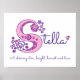 Jolie affiche de nom avec monogramme S, parfaite pour la chambre ou la salle de jeux d'une fille dans des tons de blanc, rose et violet. Personnalisez avec le nom de votre enfant commençant par S, et la signification du nom pour un effet vraiment personnalisé dans la chambre ou la nurserie de votre enfant, cet exemple est pour le nom Stella Une étoile brillante, lumineuse, honnête et vraie. Jolie impression d'affiche idéale pour un nouveau-né, un baptême ou un cadeau de baby-shower. © Lettre unique S monogramme avec coeurs et fleurs description et conception graphique par Sarah Trett. www.sarahtrett.com pour www.mylittleeden.com