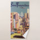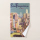 Illustration vintage d'une affiche de voyage des États-Unis d'Amérique représentant San Francisco, Californie avec une vue sur le pont de la baie et les tramways descendant California Street dans le quartier chinois.