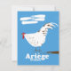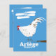 Ariège france, affiche de voyage rétro avec une poule dessinée à la main.