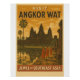 Affiche de voyage rétro du temple d'Angkor Wat, Cambodge - tours majestueuses en pierre silhouettées contre un ciel doré au lever du soleil avec des nuages doux.