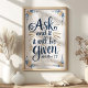 Inspirez la foi et la positivité avec cette œuvre murale "Demandez et il vous sera donné", basée sur Matthieu 7:7. Le design présente une écriture élégante entourée de feuillage doré et bleu, ce qui en fait un bel ajout à toute pièce. Que ce soit pour votre propre maison ou comme cadeau attentionné, cette pièce sert de rappel puissant du pouvoir de la prière et de la foi.