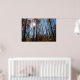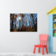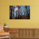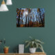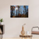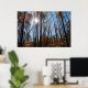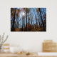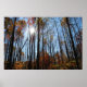 Ce poster présente le soleil brille à travers de grands arbres d'automne. Feuilles colorés, ciel bleu.
