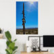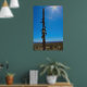 A striking view of a weathered roadside art pole covered in found objects under a bright Mojave Desert sun. The intense blue sky and sun flare create a bold, minimalist desert scene perfect for modern or eclectic wall decor.