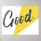 Design graphique moderne, dynamique, audacieux, ludique d'un mot "Bon" avec des triangles dans les couleurs jaune et gris. Typographie manuscrite, style trait brosse.