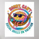 Un design coloré et dynamique, avec un personnage de dessin animé portant des lunettes de soleil assis hamac sirotant du café. Le texte coloré dit : "Désolé de ne pas avoir de compétences sociales en vacances". Ce design est disponible sur une grande variété de produits.