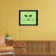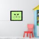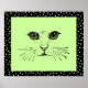 Cette affiche d'art est vert clair avec l'illustration noire d'un visage de chat avec de longs murmures et des yeux verts intenses. Il a une bordure noire avec des pois vert vif.