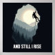 Illustration numérique monochrome frappante d'un grimpeur en silhouette à l'intérieur d'une ouverture de grotte, en rappel avec une corde. L'arrière - plan possède une forêt de pins montagneux brumeuse avec une grande lune brillante. Ci-dessous, l'expression "ET TOUJOURS je monte" est écrite en lettres majuscules blanches et en gras. La conception traduit la résilience, la détermination et la résolution des défis.