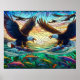 Dans la chaleur du soleil levant, deux magnifiques aigles chauds se balancent avec des talons tendus pour attraper les poissons d'un océan en dessous, tandis que d'autres oiseaux volent au-dessus des rayons lumineux colorés qui percevent le ciel du matin.