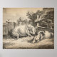 Ce dessin est orné d'une gravure avec un lave aquatiné et gris de l'artiste anglais George Morland (1763-1804). Il montre deux cochons dormant dans la paille. C'est une belle scène de vie rurale. Selon la façon dont l'image est découpée pour créer un ajustement parfait pour cet élément particulier, vous pouvez repérer les initiales G.M. sur un des poteaux de clôture. Vous pourrez peut-être aussi apercevoir un oiseau particulièrement audacieux debout sur une autre clôture.