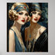 Un groupe de flappers peints de la même façon par le même artiste. C'est le cinquième de la série et dispose de deux flappers un a les cheveux rouges et porte et casquette de cloche élaboré en tissu élaboré embelli d'un grand broche de cabochons bleus et plumes rouges, bleues et or. Ses yeux sont bleus et surlignés de brun, d'une touche de rougeur et de lèvres rouges. Un collier de cristal à plusieurs brins lui donne le cou. Sa robe est à l'épaule froide. L'autre rabat a des cheveux noirs, de grands yeux bleus surlignés de gris et de marron, une touche de rougissement sur ses joues et les lèvres rouges. Elle porte une robe cousue en bleu foncé qui correspond à son casquette qui a un ruban élaboré à travers le centre et des plumes noires. Elle porte un collier de cristal à plusieurs brins. Créé avec l'aide de l'IA.