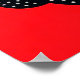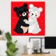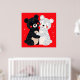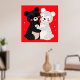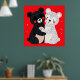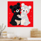 Deux ours de style dessin animé, l'un noir et l'autre blanc, s'enlacent. L'ours noir a des oreilles rondes et est orné de motifs à points, avec des joues roses qui ajoutent à son expression attachante. Il a une tache beige sur le ventre. L'ours blanc, également recouvert de motifs à points, arbore un sourire joyeux et des joues roses également. Le fond est un rouge vibrant, qui contraste vivement avec les ours. Globalement, l'illustration dégage une sensation de chaleur et d'amitié.