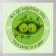 Coincés à l'intérieur d'une pod verte sont deux adorables petits pois. Chaque pois a des points pour les yeux et un sourire joyeux et gai. Autour de la marmite se trouvent des vignes et des feuilles verts. Le design est placé à l'intérieur d'un cercle vert. Autour du bord supérieur et inférieur sont les mots "nous allons ensemble comme deux pois dans un pod" en lettres vertes.