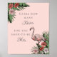 Cette affiche tropicale "Devinez combien de baisers pour la future future Mrs." présente des illustrations à thème flamingo tropicales dessinées à la main dans l'encre noire, mettant en vedette des flamants roses, des fleurs d'hibiscus et de jasmin et des feuilles tropicaux. Élégant arrière - plan rose vif.