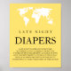 Etes-vous l'hôte d'un baby shower à thème voyage? Si votre réponse est oui, alors ceci est pour vous ! Sympa signe "couches tard la nuit" qui correspond au thème du baby shower de voyage. Consultez le reste de la collection pour les invitations assorties aux passeports, la décoration sur le thème du voyage et les jeux de baby shower. Nous avons 7 couleurs pastel : bleu, rose, violet, vert, jaune, orange et beige. Vous trouverez une correspondance parfaite pour bébé fille, garçon ou baby shower sans sexe.
