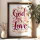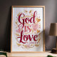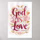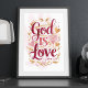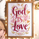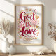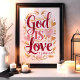 Améliorez votre espace avec ce beau mur "Dieu est amour" inspiré par 1 Jean 4:8. Le design se compose d'une palette de couleurs chaudes, rose et or, avec des coeurs délicats et des feuillages encadrant le message inspirant. Parfait pour ajouter une touche de foi et d'élégance à toute pièce, cette pièce est idéale pour ceux qui cherchent à refléter leurs croyances dans leur décoration de maison ou à donner comme un cadeau significatif.