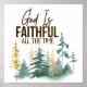 Un poster de citation inspirant représente une aquarelle naturelle simple avec une forêt de pins verts et d'or. Il comporte une citation chrétienne encourageante, "Dieu est fidèle tout le temps."