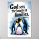 Illustration aquarelle d'une famille de pingouins serrée l'une contre l'autre. L'arrière - plan contient l'expression "Dieu met les solitaires dans les familles." dans une police vintage.