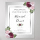 Bienvenue à vos invités dans votre dîner de répétition à thème bordeaux et argenté avec l'élégant panneau d'accueil fleuri. Éléments correspondants disponibles.