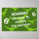 Dinosaure T-rex thème Anniversaire fête de bienvenue affiche de bienvenue. Un design animal préhistorique amusant pour les enfants. Personnalisez avec nom et âge. Impression silhouette de dino t-rex vert.