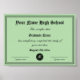 Poster du modèle du diplôme d'études secondaires avec sceau rond. Design élégant avec texte personnalisé et nom de diplômé personnalisé. Arrière - plan couleur vert ou personnalisé. Aménagement classique avec bordure fantaisie et espace signature. Diplôme officiel de fin d'études, document d'excellence, garantie éducative, dossier professionnel et grand prix de réussite pour les étudiants, les travailleurs, les athlètes sportifs et plus encore. Papier lourd. Aussi grand comme prix d'apprentissage pour clinique, académie, collège, université, séminaire, événement, formation, cours, cours en ligne numérique etc.