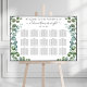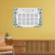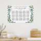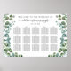 Affiche élégante de plan de table de mariage avec un monogramme de style calligraphique moderne des noms des mariés et un design de verdure aquarelle organique avec feuillage d'eucalyptus, feuilles et branches d'eucalyptus dollar argenté dans des nuances verdâtres douces de menthe, vert, olive et bleu-vert atténué. Parfait pour un événement de printemps ou d'été. Personnalisez avec les noms de vos invités de mariage et les numéros de table pour votre jour de mariage rustique chic.