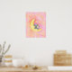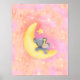 Ceci est une affiche adorable pour la nurserie d'une petite fille ou pour la chambre d'une petite fille. L'image est celle d'un bébé éléphant fille dormant sur un croissant de lune entouré d'étoiles, avec du rose et de la pêche comme couleurs principales.