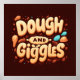 Un design fantaisiste et ludique avec le texte "Dough and Giggles" dans une police caricaturale aux couleurs vives et ludiques. La composition générale est légère et invitante, évoquant un sentiment de joie et de rire.