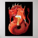Poster du Dragon de bière. Design graphique d'un dragon rouge buvant de la bière tout en faisant le signe métallique lourd des cornes avec sa main. Illustration amusante pour les amateurs de bière.