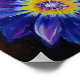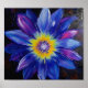 This abstract poster features a vibrant blue and purple flower painting with a glowing yellow center, vivid layered petals, and dramatic textured contrast.