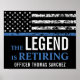 Ce design présente un drapeau de force de police avec des bandes noires et blanches, ainsi qu'une bande de ligne mince bleue. Le texte "La légende prend sa retraite" est situé au-dessus du nom personnalisable de l'agent de la force publique, shérif, capitaine ou chef qui part à la retraite. Célébrez cet événement marquant avec style !